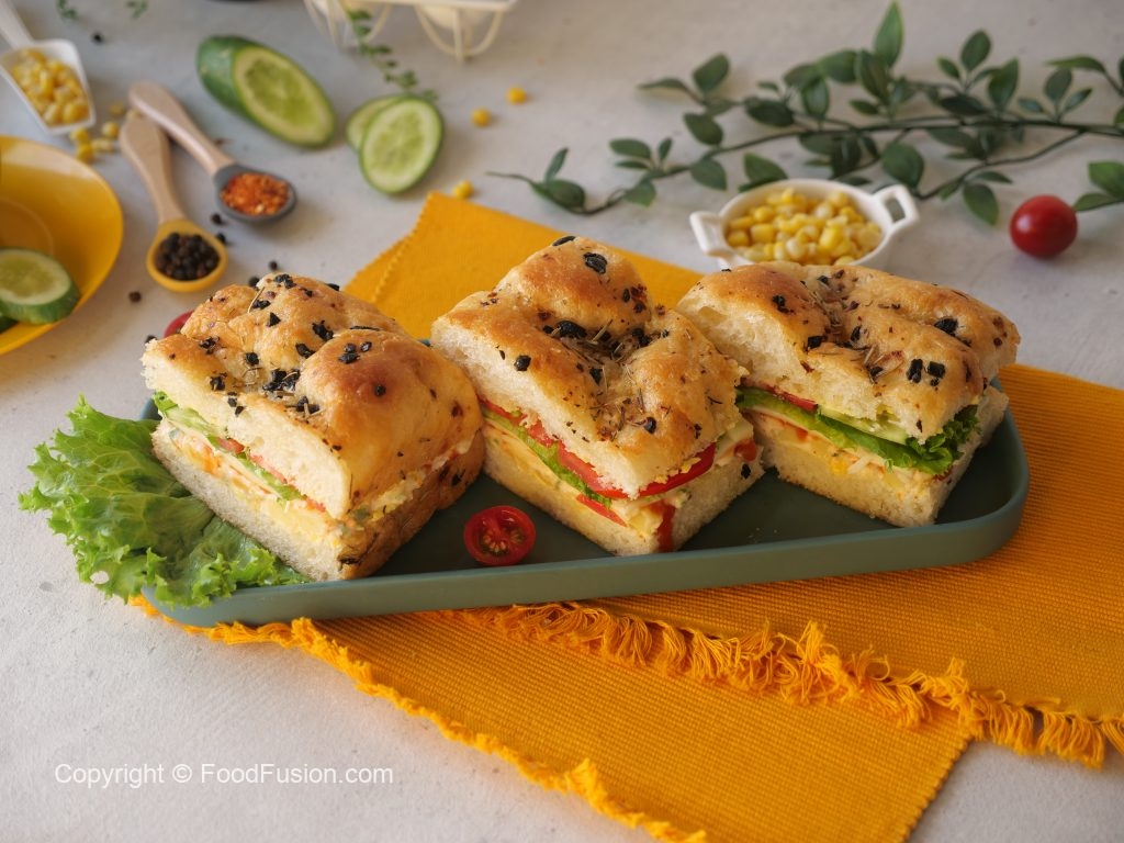 Cut focaccia bread from center and apply butter on both sides of bread.