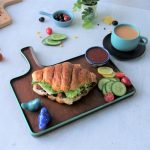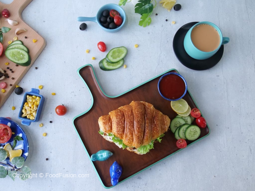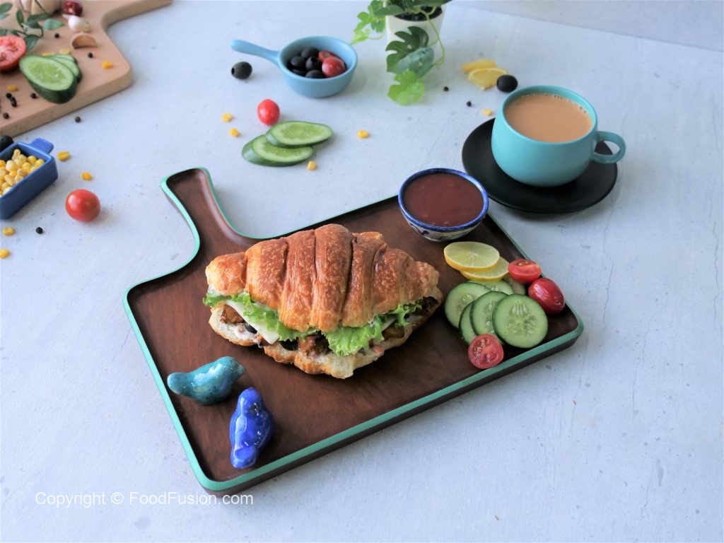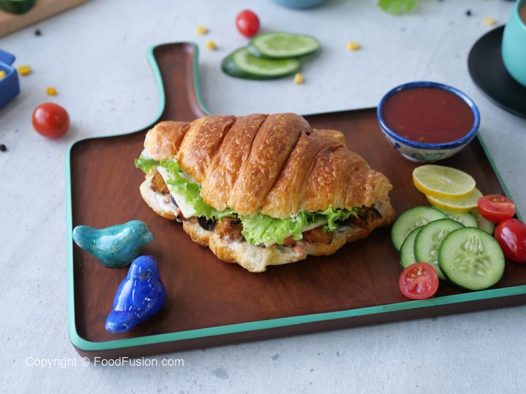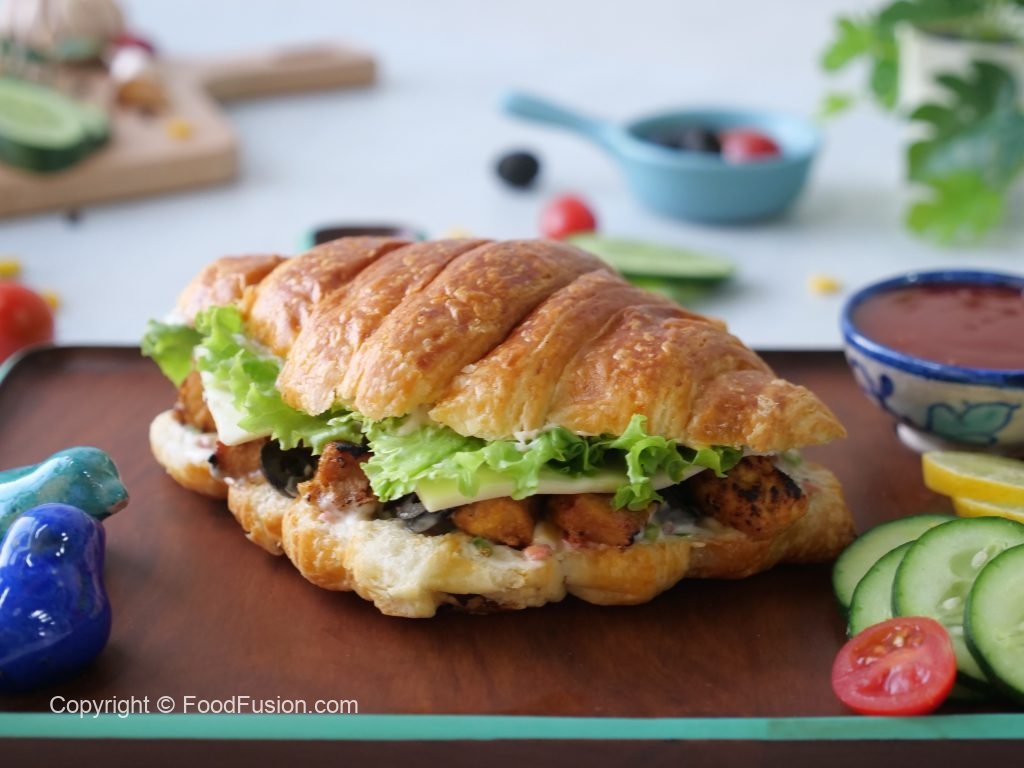 Cut croissant in half,add & spread prepared spread on both sides,add leftover chicken tikka,black olives slices,cheese slices,lettuce leaves,flip another bread slice to make a sandwich (makes 2-3 sandwiches) & serve!