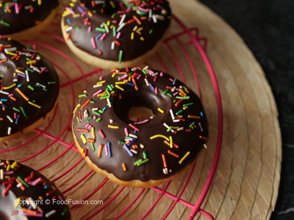 Doughnuts rakh dein,non-stick spray karein aur 150C per 4-5 minutes kliya bake ker lein.