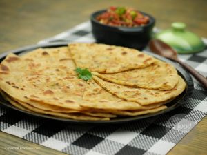 Roll out another dough and put filling/stuffing in the center, place another round dough on top, seal edges and roll out carefully with the help of rolling pin.