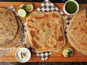 Heat griddle and place rolled paratha on it, fry from both sides with ghee.