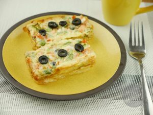 Pour the mixture in the tray compartments and put cheese and few olives on top of it.