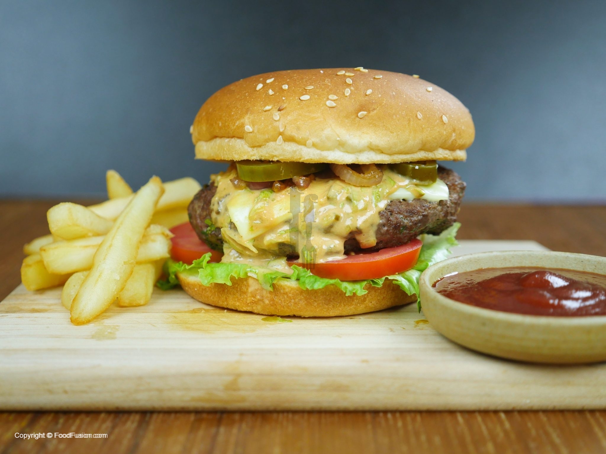 In assembling you can add any vegetable of your choice and assemble burger any ways you like. How we did is: On bun spread mayonnaise, ice burg lettuce leaf, tomato slices, beef patty with cheese, fusion sauce, caramelized onion or raw onion slices, jalapenos slices and top bun.