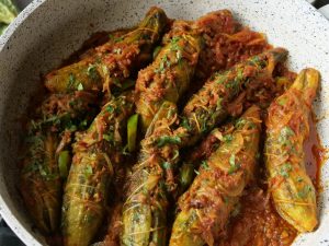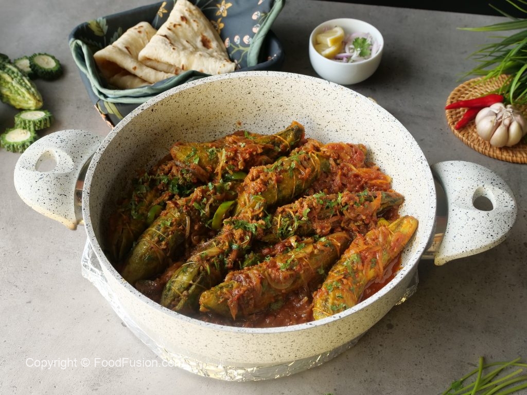 -Add stuffed bitter gourds,cover & steam cook on low flame for 5-6 minutes.