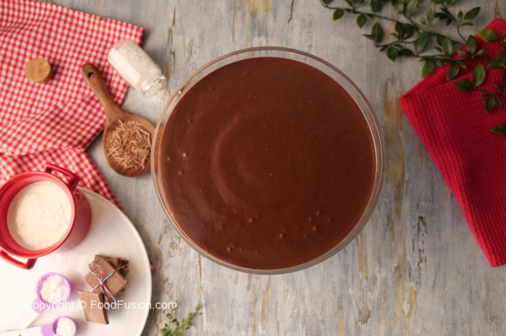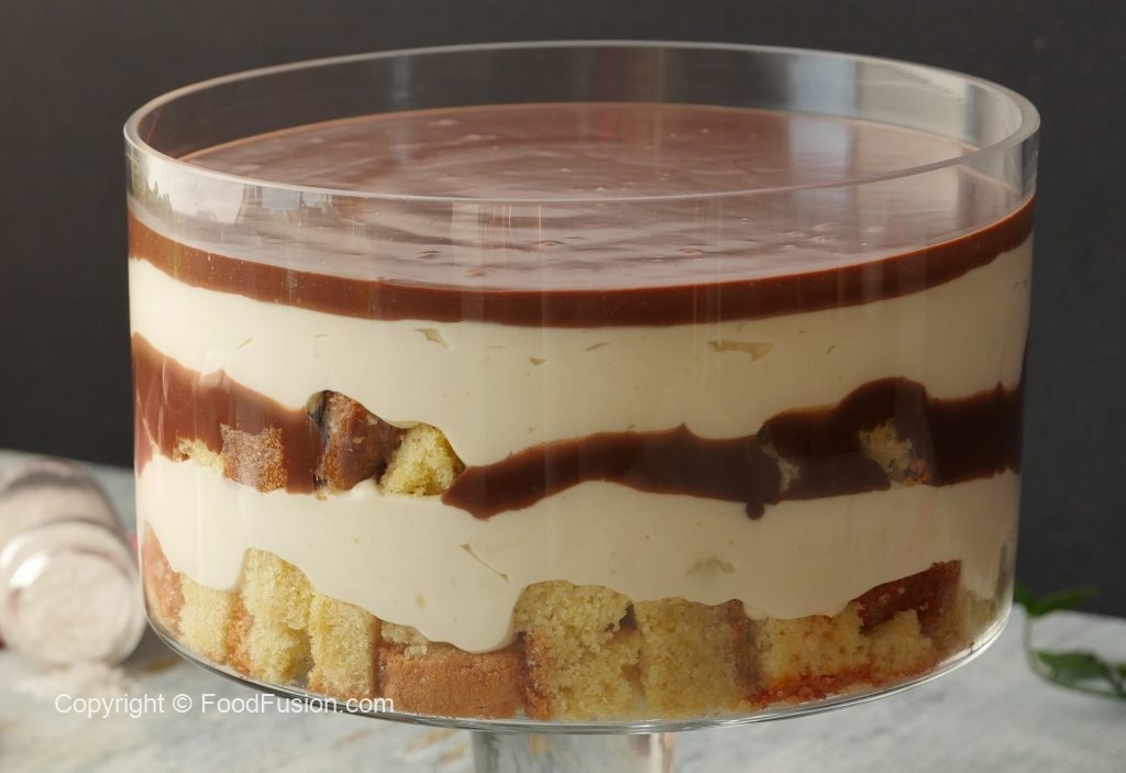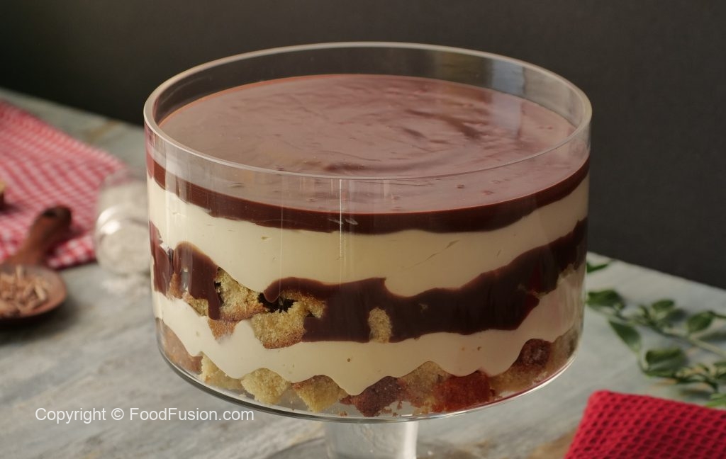 -Serving dish may sponge ki layer, prepared boston cream, spong cake, prepared chocolate ganache, prepared boston cream daal den. Ab upar se chocolate ganache daldein aur thanda ho janay tak refrigerate ker lein.