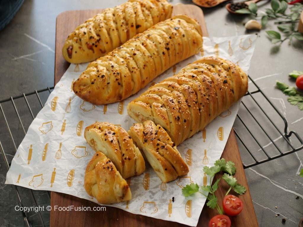 -Braid ki tarhan overlap kertay hoye bread ka cuts ko alternately bund kertay jayein.