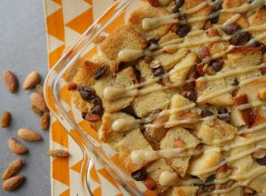 Add bread cubes,almonds,raisins,chocolate chips,prepared egg mixture,bread cubes,raisins,almonds, chocolate chip and prepared egg mixture.