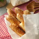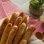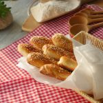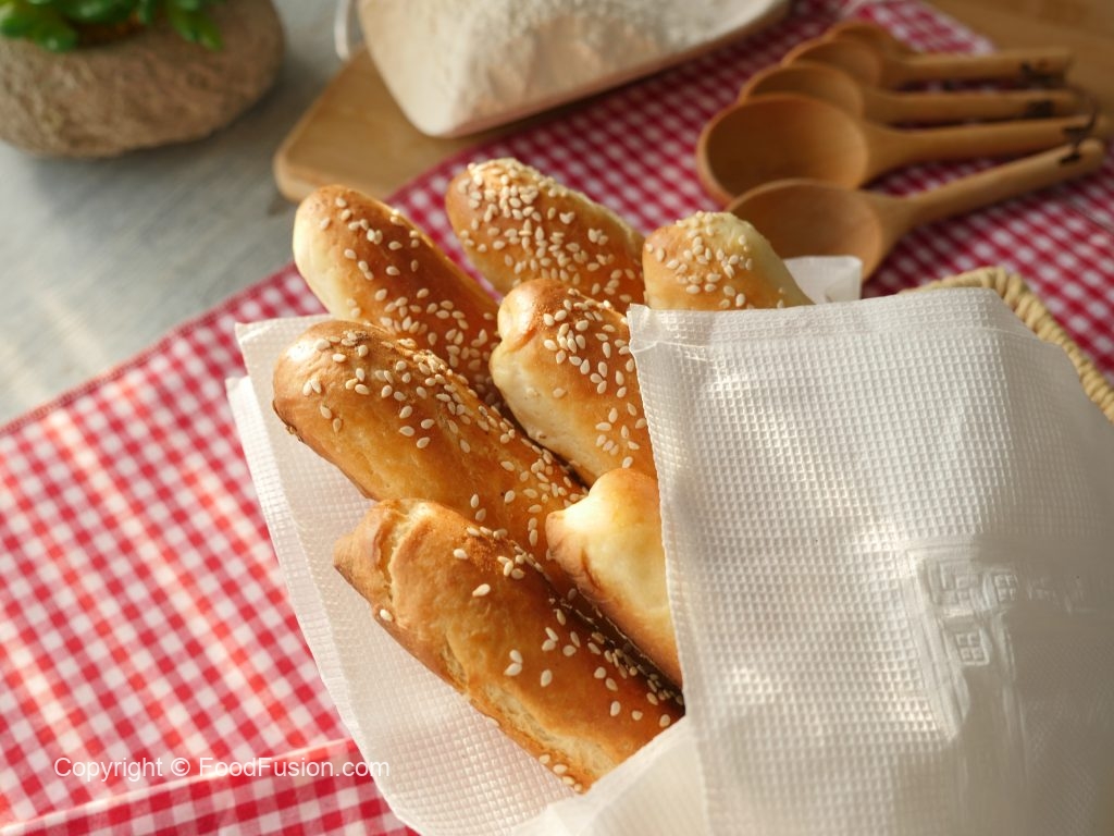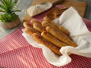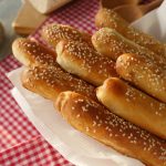 Brush breadsticks with egg white+water and sprinkle sesame seeds.