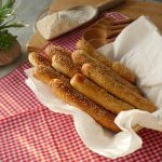 Knead dough again then divide dough into 14-15 strips (7 inches) and shape each into a uniform roll or long breadsticks.