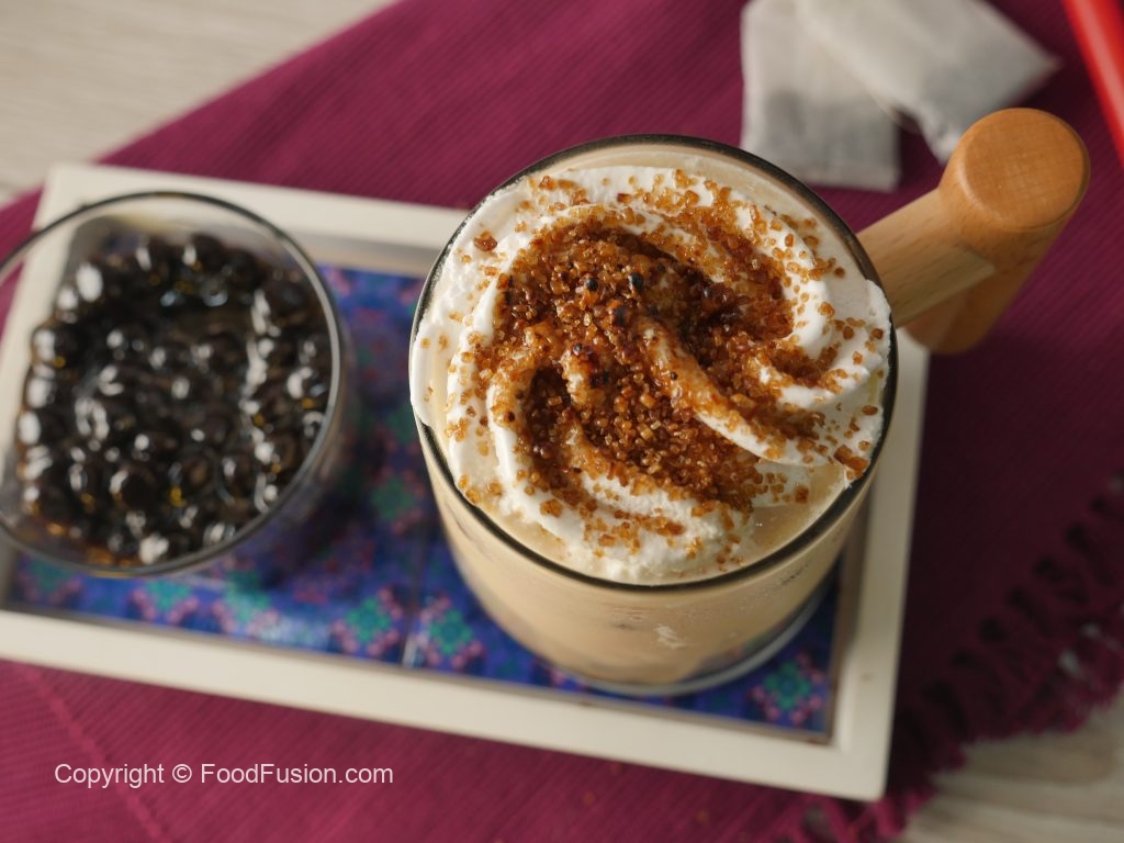 In a serving or mason jar,add ice cubes,prepared boba pearls with syrup,prepared black tea,prepared milk syrup and top it with whipped cream,sprinkle brown sugar and burnt with blow torch & serve!