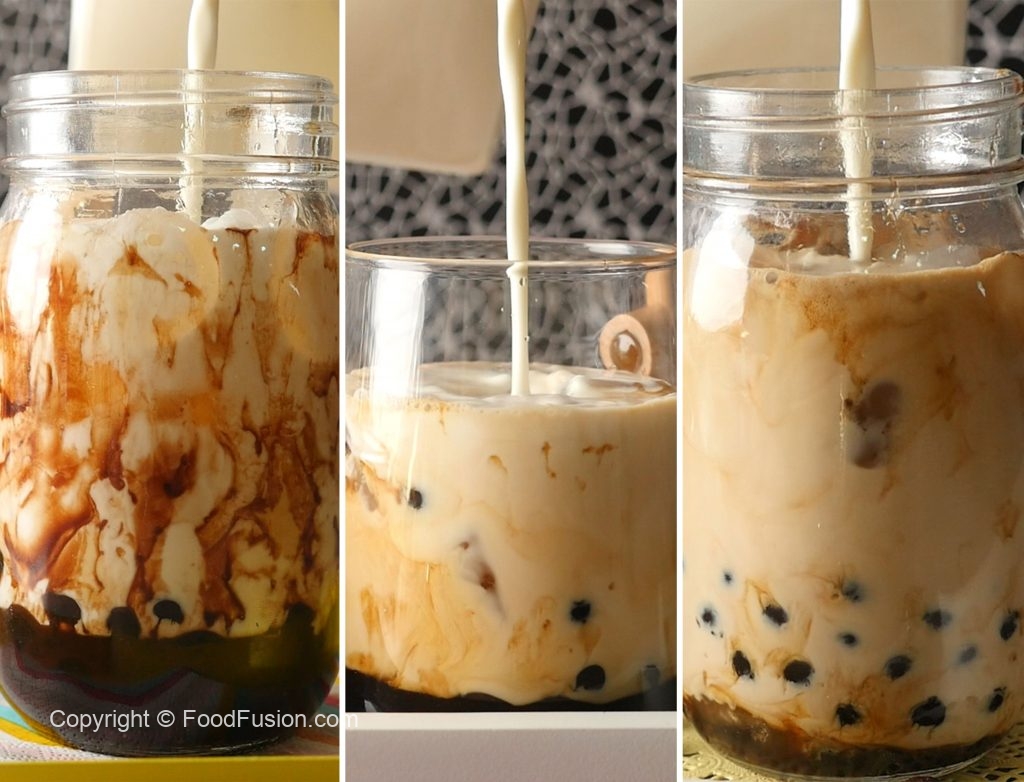 In a serving or mason jar,add prepared boba pearls with syrup and roll the jar to coat the walls with melted sugar,add chocolate syrup,ice cubes and prepared milk syrup,stir & serve!