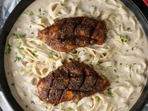 -Sprinkle 2-3 tbs prepared cajun seasoning on both sides of chicken & rub evenly (reserve remaining for sauce) & let them rest for 2-3 minutes.