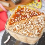 When sugar is completely dissolved,carefully spread ¼ cup caramel on baking sheet,sprinkle almonds & let it cool completely then break into small pieces & set aside.