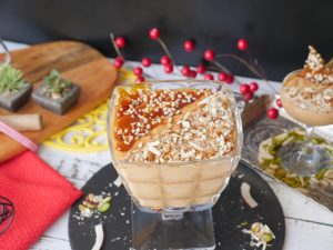 In serving dish,add caramel firni,garnish with almonds,caramel crunch & serve!