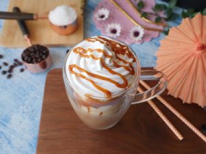 Serving glass k sides pe caramel sauce daalen or caramel Frappuccino glass may nikal len.