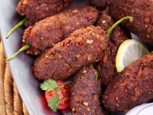 -Take small quantity of chapli kabab mixture & flatten it on your palm,place stuffed green chilli in the center & coat evenly.