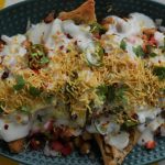 In serving dish,add fried samosa and crush slightly,add cooked chickpeas,onion,tomato,green chili,chaat masala,red chili crushed,lemon juice,green chutney,yogurt,nimco sev,fresh coriander,red chili crushed & serve!