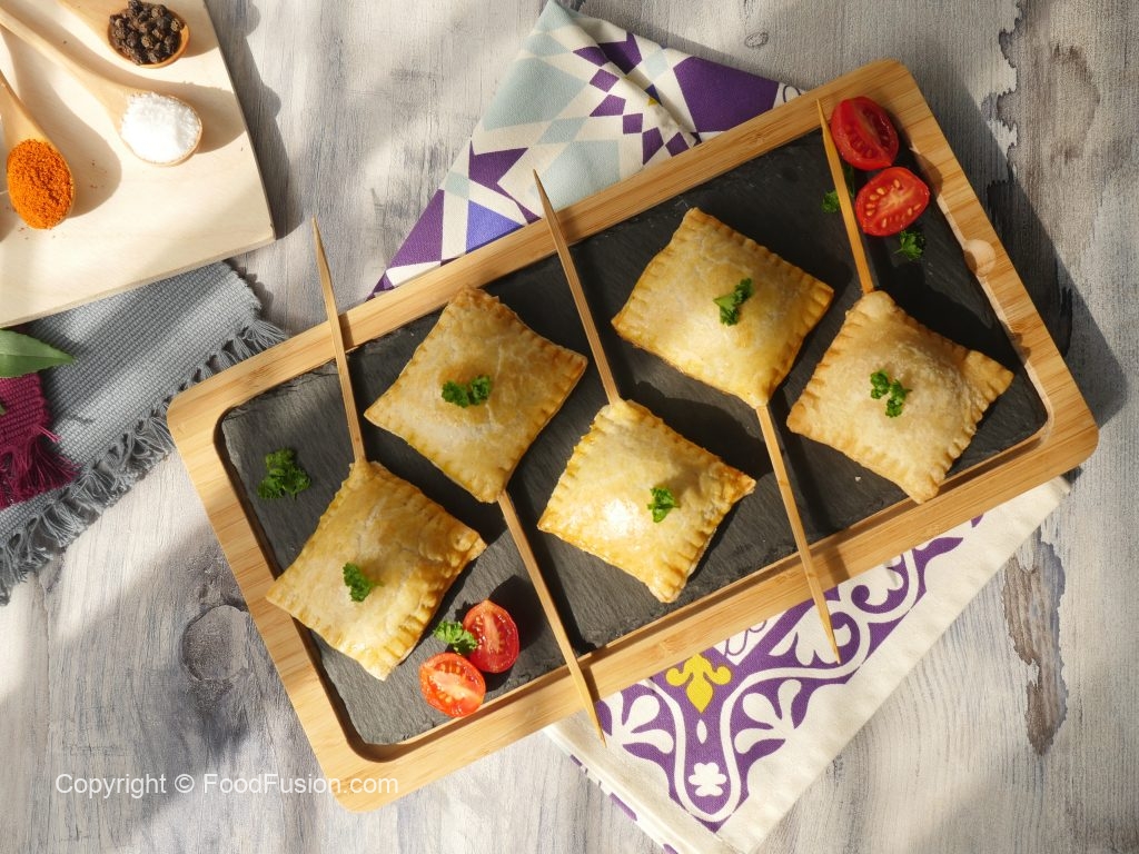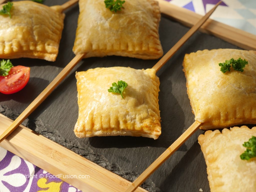 At one corner of the piece,place skewer,add prepared chicken filling (1 tbs) and cover with another piece,press and seal the edges with the help of the knife (makes 20).