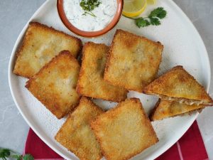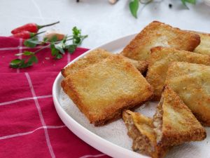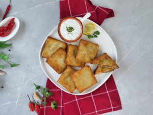 -Now dip prepared samosa parcel into eggs then coat in breadcrumbs.