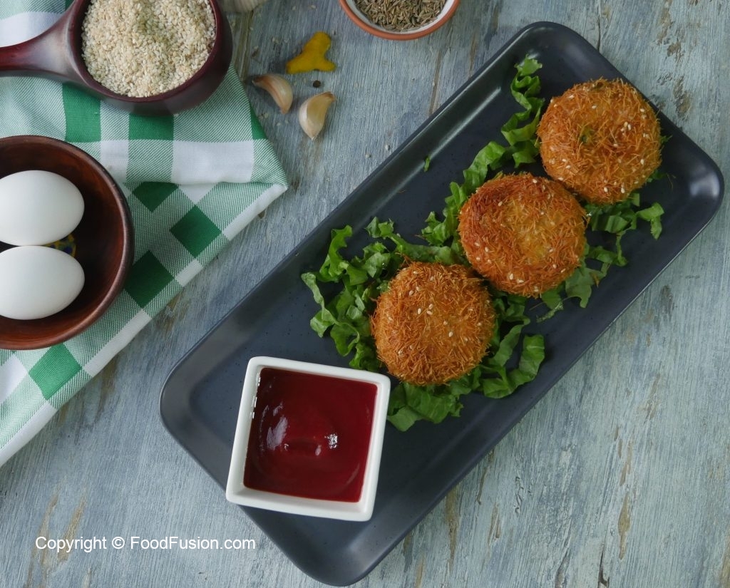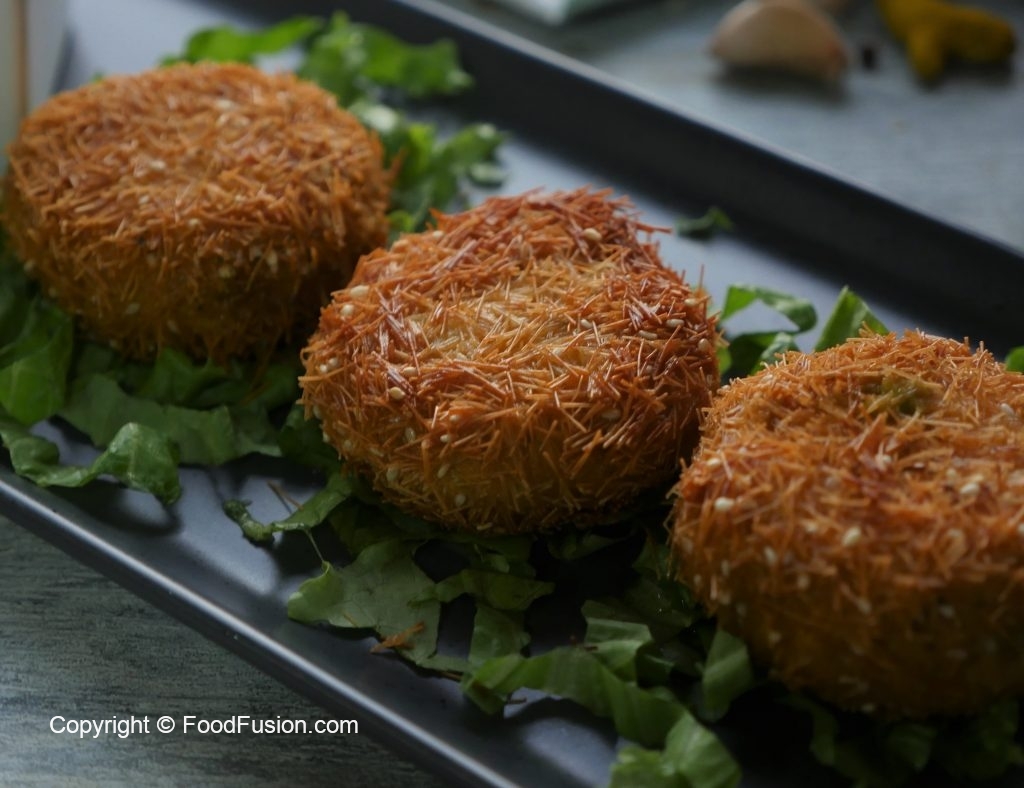 Now dip cutlets into beaten eggs and coat in crushed vermicelli.
