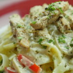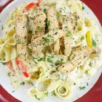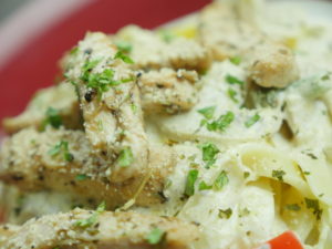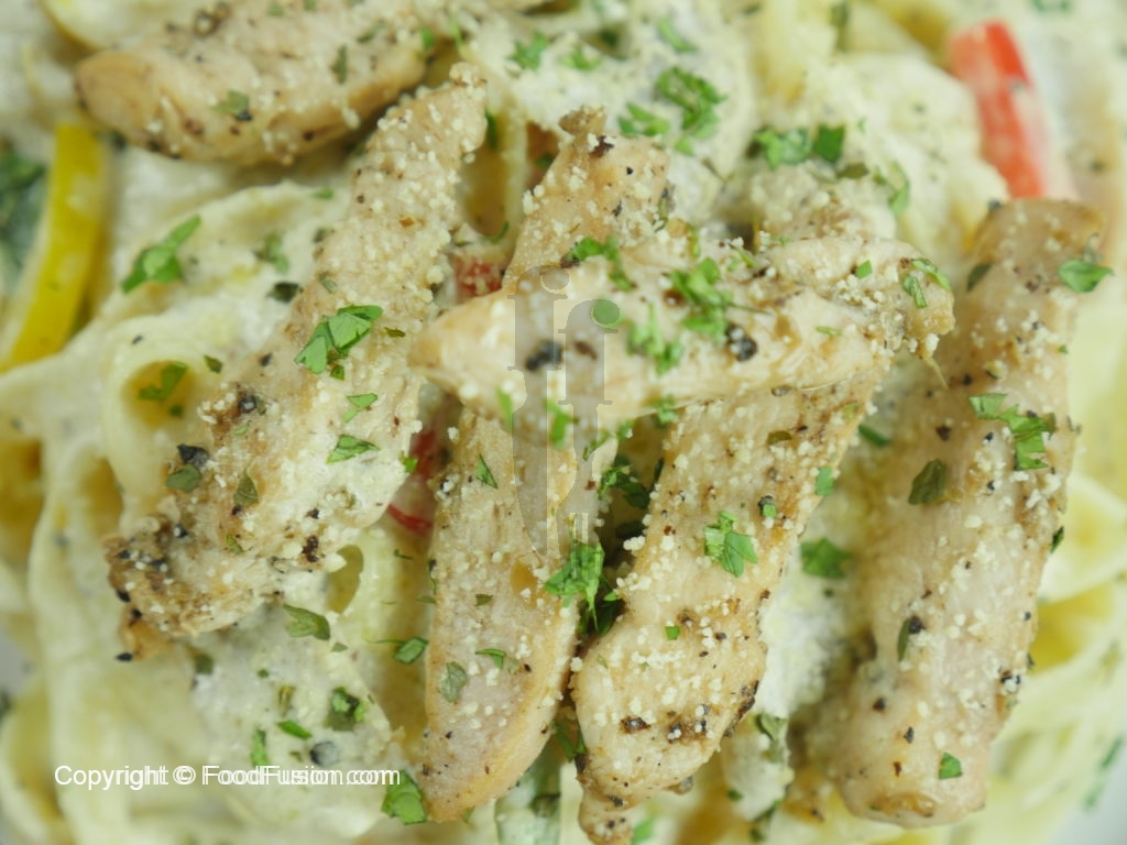 For Plating, add pasta first, then pour alfredo sauce, sprinkle cooked chicken and lastly add parmesan cheese and parsley on top for garnishing.