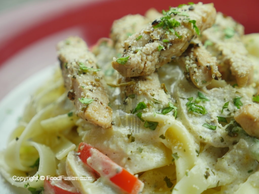 Plating ke liye pehle pasta set karein, phir sauce daalein, chicken daalein aur akhir main parmesan cheese aur parsley se garnish karein.