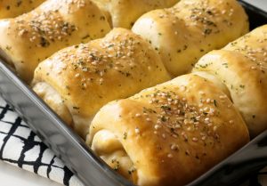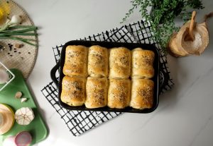 7.5 X 11” baking pan ko tayyar herbed butter sa grease ker lein,dinner rolls rakh dein aur dhak ker 20-25 minutes kliya proof ker lein.