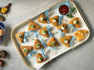-Take out potato mixture tray from freezer & cut into triangle shape.