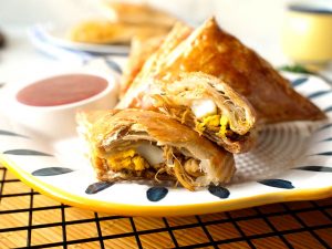 Lined baking tray with butter paper,place chicken curry puffs,apply egg yolk & bake in preheated oven at 180C for 25-30 minutes.