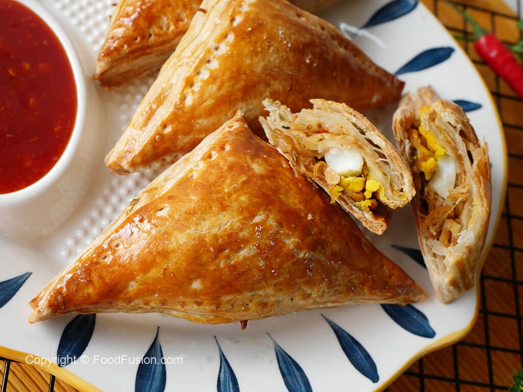 On each puff pastry square,add prepared filling & egg wedge in the center (skip egg if storing),apply water on the edges,flip the other side & press the edges to stick together and prick with fork to seal the edges (makes 18).