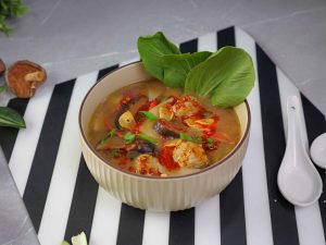 -Serving bowl mein wonton soup daal kar upar se bok choy leaves, chilli oil, spring onion leaves aur fried garlic daal kar serve karein.