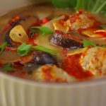 -Chicken mixture ka 1 tbs le kar broth mein daal dein, dhak kar 5-6 minute medium flame par cook karein (10-12 wontons ready ho jayein ge).