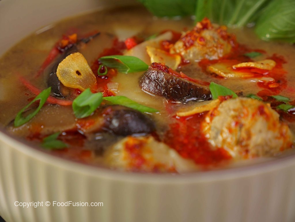 -In a serving bowl,add wonton soup,bok choy leaves,chilli oil,spring onion leaves,fried garlic & serve!