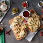 -Add & spread pizza sauce,add cooked chicken,onion,tomato,pickled jalapenos,mozzarella cheese,cheddar cheese,dried oregano & red chilli crushed (makes 6).