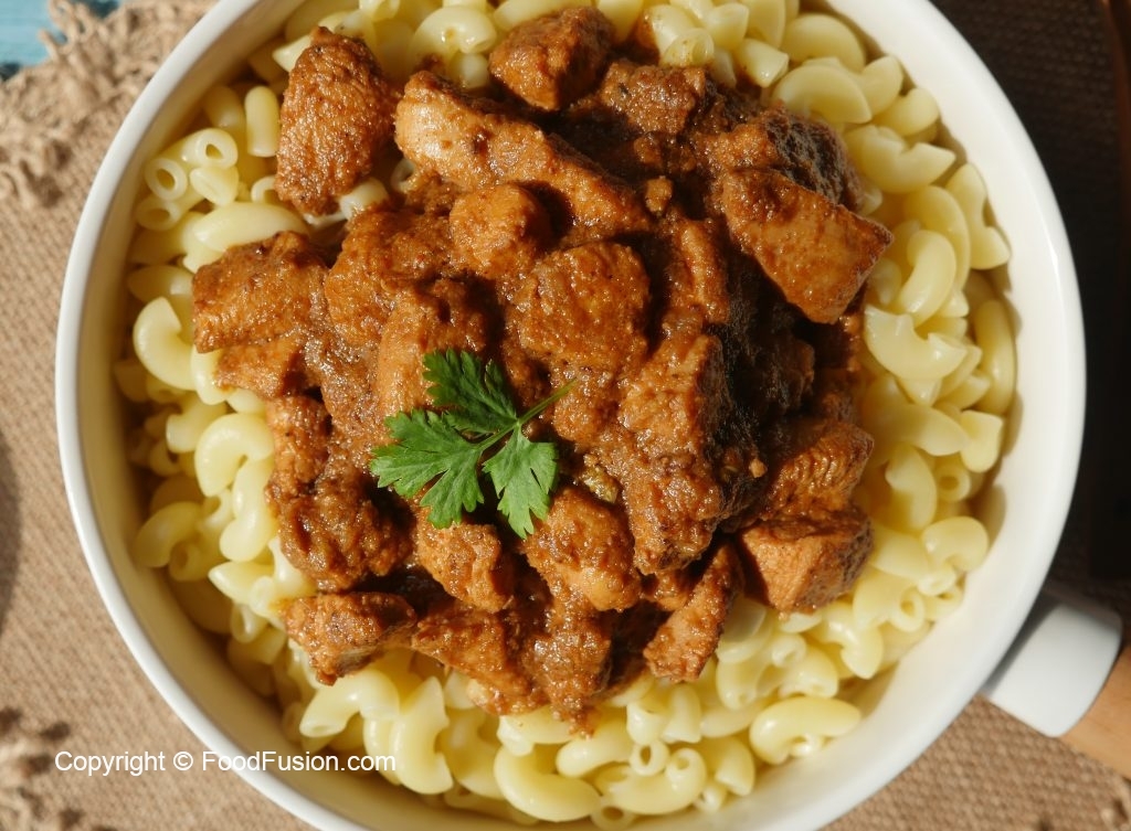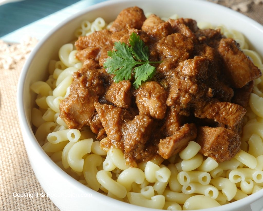 Serving dish mein boiled macaroni aur korma masala dal ker serve karein!
