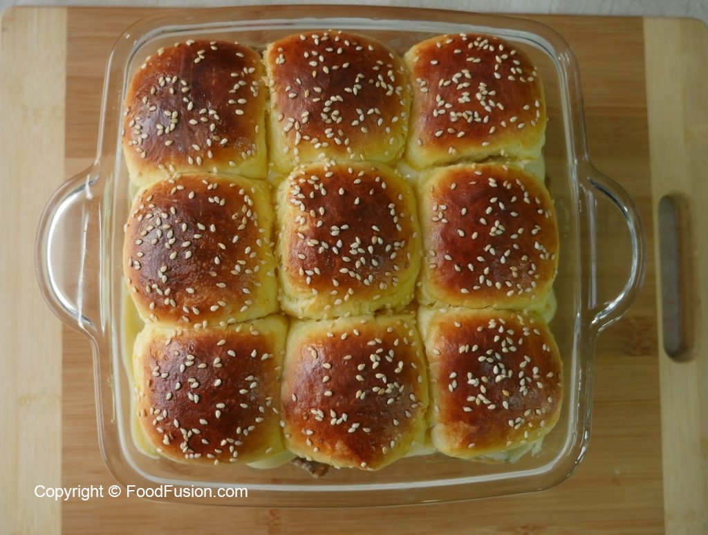 In baking dish,place sliders,cheddar cheese slices,cooked vegetable sauce,nuggets,mozzarella cheese slices and place top sliders buns (makes 9-10 sliders).