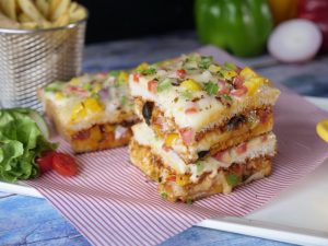 In baking dish,place burger buns,add tomato ketchup,cheddar cheese,cooked chicken mixture,pickled cucumber,onion slices,mozzarella cheese slices and cover with top buns.