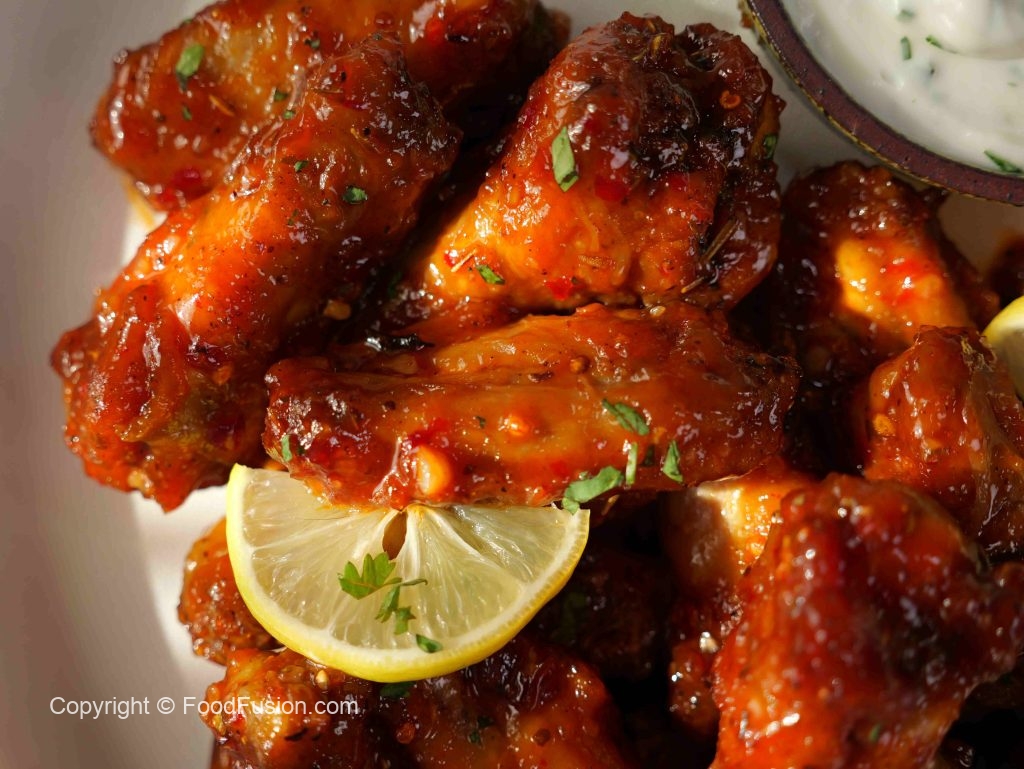 -In a bowl, add air fried chicken wings, pour some prepared chilli milli sauce, coat well.
