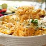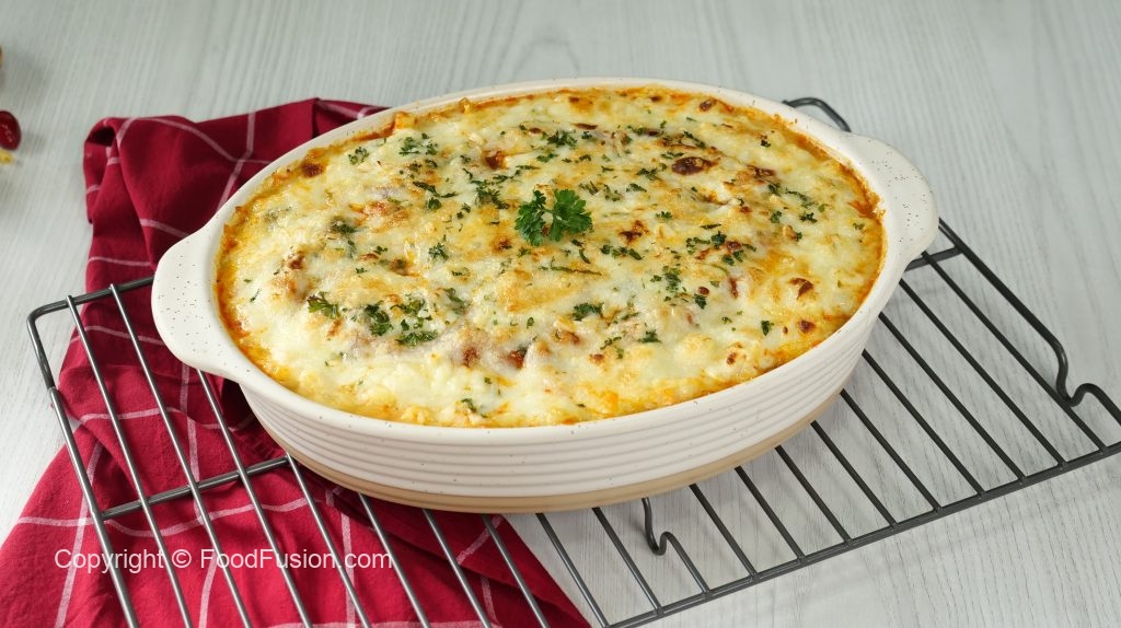 -Baking dish mein tayyar mince mixture,mac & cheese,mince mixture,mac 7 cheese,mince mixture, cheddar cheese,mozzarella cheese & fresh parsley dal dein.