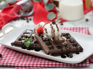 -On chocolate waffles,pour prepared chocolate sauce,cookie crumbs,olper’s whipped cream,chocolate chips, icing sugar & garnish with banana slices,cherry & mint leaves.