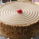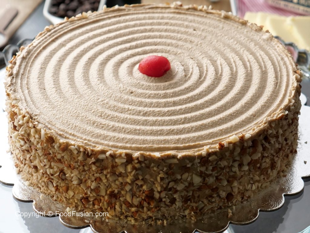 Cake stand per cake ki first layer rakh dein,coffee syrup aur coffee butter frosting dal ker pheela lein,badam dal dein aur cake ki top layer rakh dein.