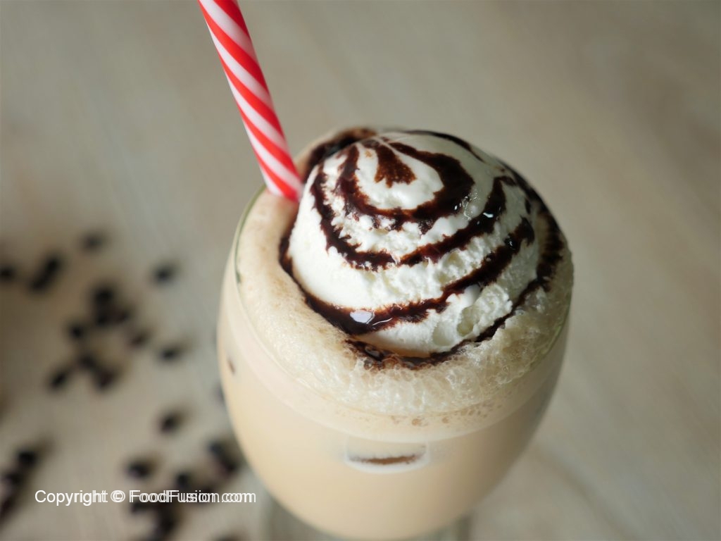 In serving glass,add ice cubes,pour prepared cold coffee,add ice cream scoop and drizzle chocolate syrup & serve.