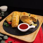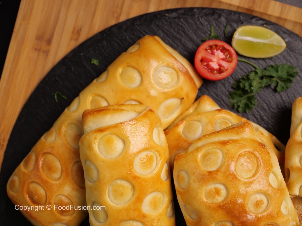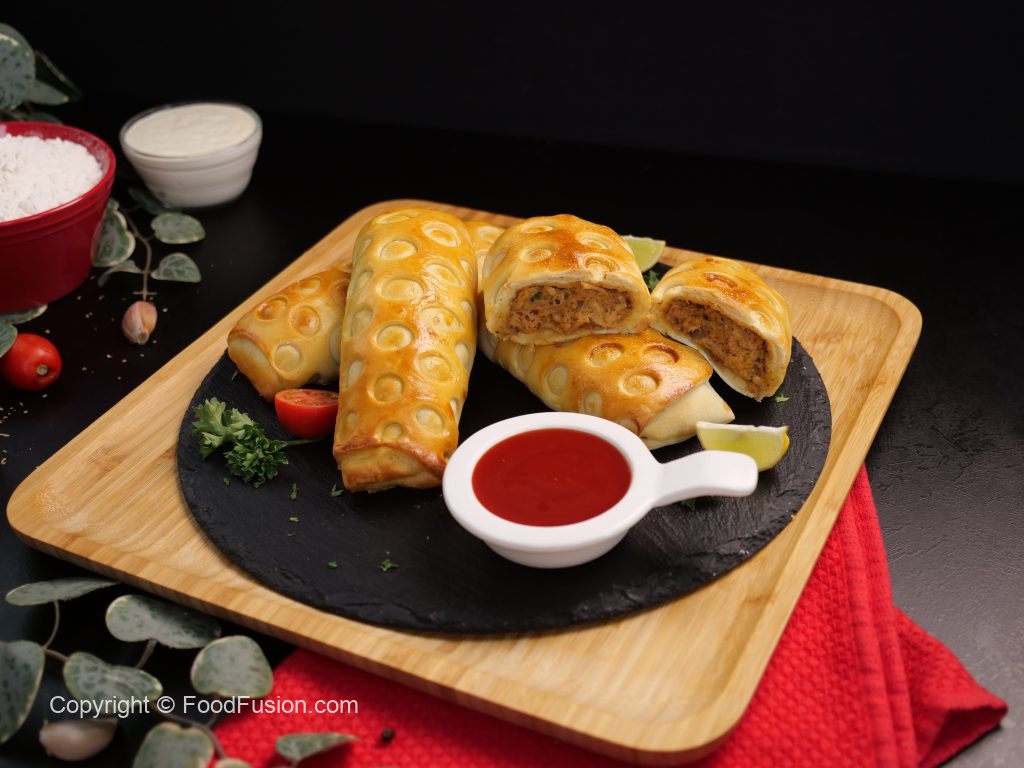 -Add 2 tbs of prepared chicken filling on rolled dough & roll it till half.