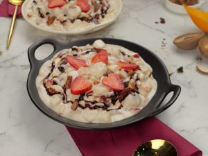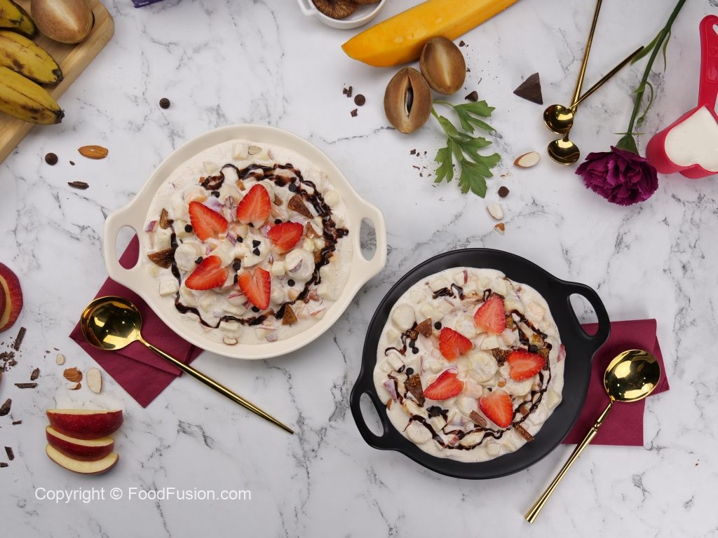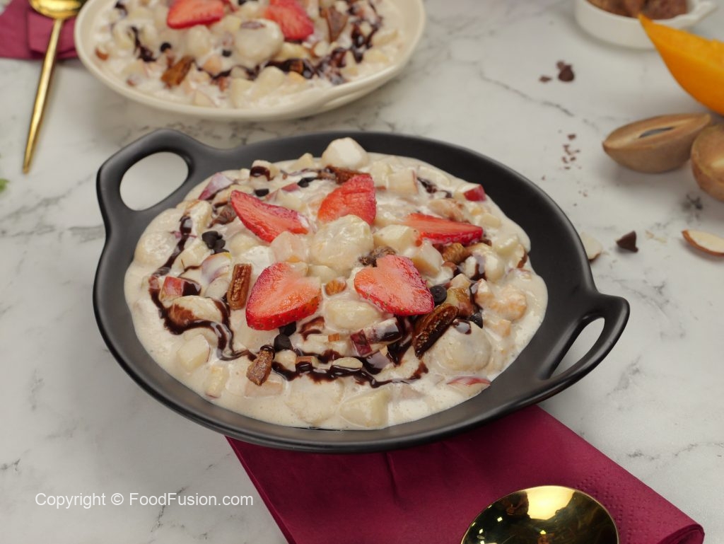 -In serving plate,add creamy fruit chaat,dried figs,almonds,chocolate ganache,creamy fruit chaat, chocolate chips,garnish with strawberry & serve!