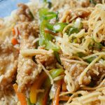 Serving dish mein fried rice,crispy fried chicken with vegetables aur fried egg noodles,hara pyaz ka leaves dal ker serve karein.