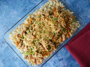 In serving dish,add fried rice,crispy fried chicken with vegetables,fried egg noodles (crush with your hand), green onion leaves & serve!