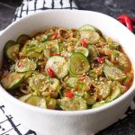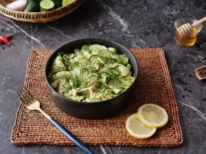 -In a bowl,add cucumber,white onion,garlic,spring onion,red chilli crushed,salt,sesame seeds,paprika powder,vinegar,soy sauce,sesame oil,honey & mix well.
