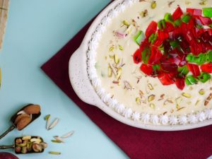 -Decorate with whipped cream,red & green jelly,pistachio,almonds & serve chilled.