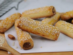 -Place rolled date filling on the dough,roll the dough slightly & seal the edges then cut the dough into 3” finger cookie.