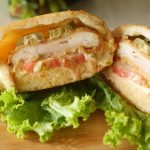 Place cheddar cheese slice,jalapenos,chicken patty,pickled cucumber,tomato slice,prepared sauce, mozzarella cheese slice,gather and seal all edges.